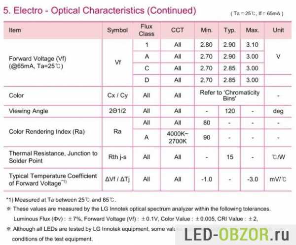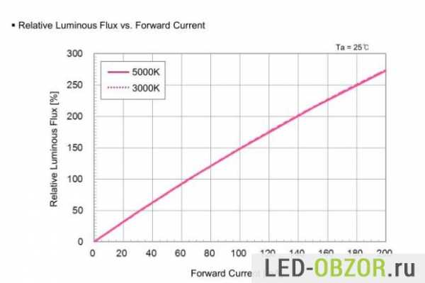 Светодиоды у Дилас W5W применяются типа 5630 производства LG Innotek. Судя по данным производителя, эффективность на токе 65 мА достигает 188 лм/Вт. Поскольку рассматриваемые образцы работают на меньших токах, то по графикам и характеристикам в таблице можно найти реальную светоотдачу – 200 лм/Вт у автомобильных светодиодных ламп для передних габаритных огней с обманками и 205 лм/Вт без. С учетом 10% и 5% снижения светового потока при 80° и 60° градусов, светоотдача получается 180 и 195 лм/Вт.