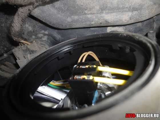 5) После того как мы установили лампу в крепление, просовываем ее в отверстие в фаре (тут она также проходит без проблем), вставляем до конца, чтобы пластиковое крепление встало плотно. Вот уже установленная лампа в фаре.
