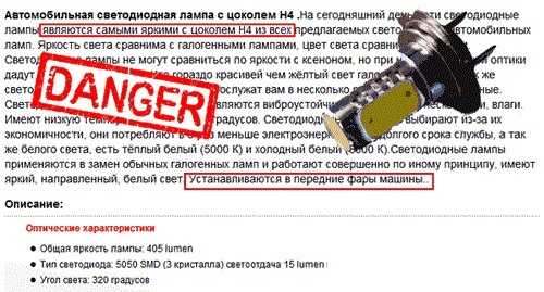 Из рекламы: «на сегодняшний день почти в каждом автомобиле стандартные лампы меняют на светодиодные…светодиодные лампы — это новое слово в освещении, они яркие, мощние и очень эффективные… служат очень долго, её яркость просто фантистическая, такие лампы можно устанавливать в дальний и ближний свет».