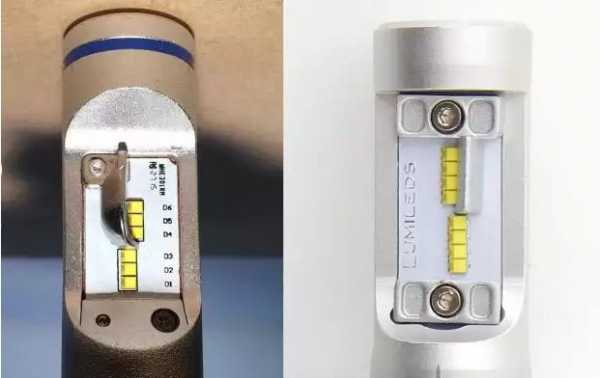 На фото ниже слева Филипс с тремя светодиодами (правильный пример) и его копия Китай но уже с четырьмя (что не соответствует длине нити накала и что в результате приведёт к неправильной границе света от фар и ослеплению)