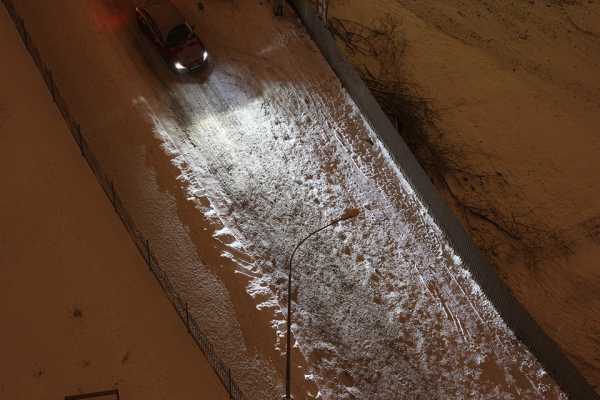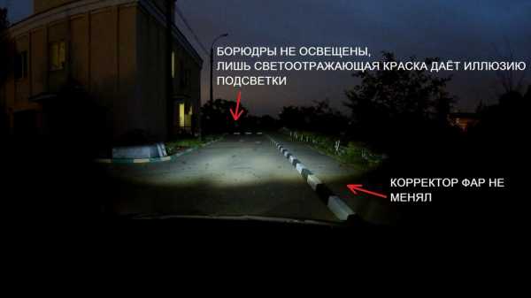 Видно, что бордюрные камни освещены лучше, чем светодиодами. Были ещё включены туманки.