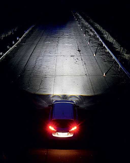 Ближний свет диодных фар Nissan Tiida. Обратите внимание на резкую границу между пятном освещённости и переходом в неосвещённую зону. У галогена такого нет.