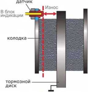 Состояние и оставшуюся высоту колодок не всегда возможно точно определить путем визуального осмотра, не снимая колесо, а также по пробегу автомобиля. Для того, чтобы предупредить водителя о наступившей необходимости замены, на корпусе колодки установлен специальный индикатор – пискун. Индикатор износа настроен таким образом, чтобы по достижении минимального остатка высоты фрикционного материала он начинает контактировать с поверхностью тормозного диска, издавая характерный свист при трении.