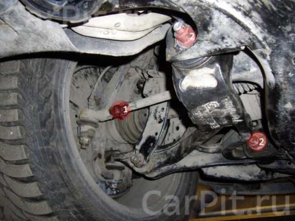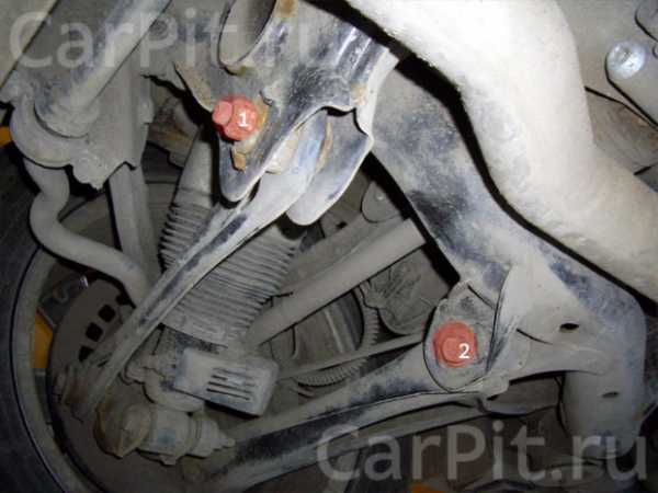 Спереди регулируется схождение (1), развал и кастор (2). Развал и кастор регулируются эксцентриками на нижнем рычаге, а схождение – путем вкручивания или выкручивания рулевой тяги из наконечника с последующей фиксацией контргайкой.