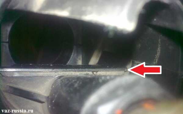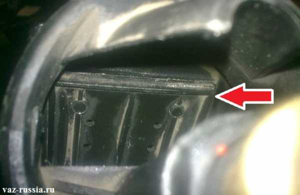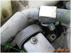 Месторасположение терморегулятора очень простое, а все почему? Да потому что он находится на самом кончике забора воздуха, а кончик забора воздуха это основная часть корпуса воздушного фильтра. Ниже приведено фото с указанием на местонахождение терморегулятора: