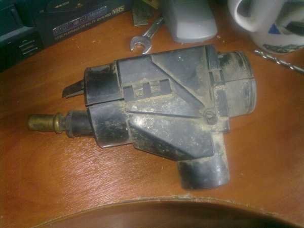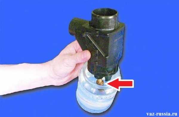 Нас будет интересовать вот эта штучка, как раз эта колба и осуществляет движение заслонки. После мойки, хорошо высушив, ее надо засунуть в морозилку минут на 15-20 чтобы она остыла. После этого ее шток должен находится в таком состоянии.