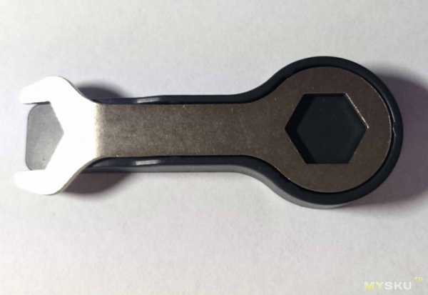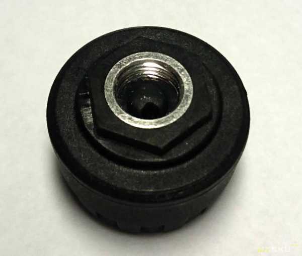 Теперь посмотрим, как меняются батарейки. Сначала нужно снять защитное колечко внизу датчика. Оно распределяет нагрузку от гайки на корпус, защищая пластмассовые фигурные выступы. Теперь нам понадобится странная шестиугольная штука. Разделив её пополам вставляем датчик крышкой в половинку с большим углублением. Половинку с меньшим углублением прикладываем со стороны ниппеля и откручиваем крышку. Под ней обнаруживается держатель для батарейки. Всё ниже залито компаундом. Налюбовавшись, собираем датчик в обратном порядке.