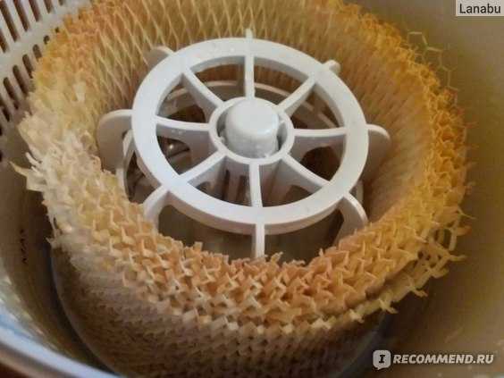 Устройство его очень простое: по сути это емкость с водой плюс вентилятор. Внутри емкости — так называемый испаряющий фильтр, впитывающий воду. На деле этот фильтр ничего особо не очищает, просто увеличивает площадь испарения. Разве что известковые отложения из воды оседают на нем. Благодаря такому устройству от увлажнителя нет налета в помещении, но вот фильтр за две зимы (а найти сменный в продаже мне, почему-то, не удалось) загрязнился прилично. В отзывах об этом увлажнителе пишут, что фильтр бумажный, но, я думаю, это не так, иначе бы он давно размок. В инструкции сказано, что ипаритель можно обрабатывать уксусом, я не пробовала. Несколько раз замачивала в горячем растворе лимонной кислоты, но от налета это не помогло.