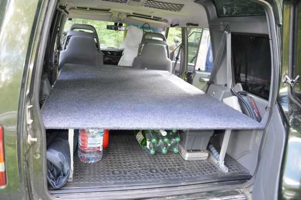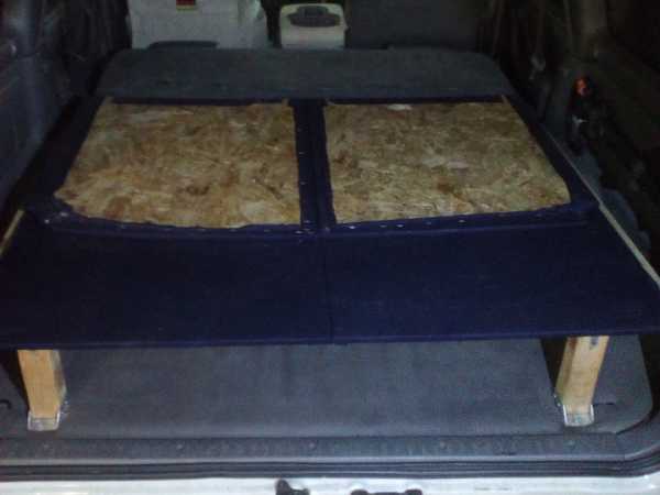 Если ночевки в автомобиле постоянная практика — стоит озаботиться созданием полноценного спального места. Для этого нужно изготовить некую инженерную конструкцию, упрощенный вариант которой делается следующим образом: складываете спинки задних сидений и на их уровне монтируете полку, перекрывающую все пространство багажного отделения. Сверху кладете коврики или матрас — и полноценная кровать готова. Легко складывается и не занимает места, к тому же разделение багажника на два отсека весьма функционально: проще грузить снаряжение, чтобы достать ящик с инструментами или канистру, нет необходимости выгружать все лежащее сверху. Недостаток такого спальника в том, что все же приходится перед сном вытаскивать из машины часть снаряжения.