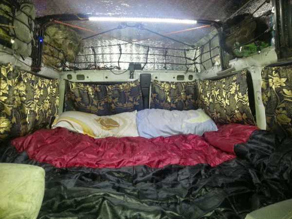 Чтобы избежать лишних процедур по подготовке ко сну, придется подойти к вопросу обустройства спальника всерьез. С помощью профиля и панелей можно изготовить конструкцию, которая будет одновременно выступать и в роли постели, и в качестве многосекционного ящика. Как именно реализовать подобный спальный блок, решать вам. Можно ограничиться съемной лежанкой, а можно вмонтировать выдвижной стол и газовую плиту, провести рукава для теплого воздуха от печки или автономного обогревателя салона. Главное, сделать конструкцию легкосъемной, иначе, единожды смонтировав в салоне, вы будете лениться снимать ее между поездками. Хотя если сделать ту секцию, которая устанавливается поверх (или вместо) задних сидений, складной, то мешать она вам ничем не будет.