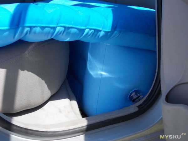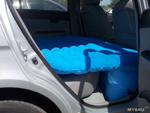 По длине матрас отлично вписался в ширину салона моего Hyundai Accent. Что касается ширины, то для полного разворота матраса пришлось сдвинуть передние сидения максимально вперед. Это означает, что в моей машине нельзя будет использовать матрас в движении, в отличие от автомобилей с большим салоном. В качестве вынужденной меры можно конечно для большей гибкости накачивать матрас не полностью, ведь подпорки, закрывающие места для ног надуваются независимо.