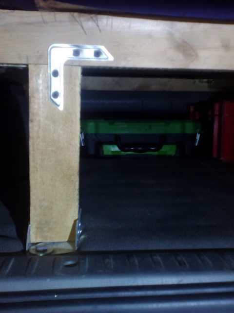 Изначально хотел делать спальник из квадратного облегчённого металического профиля, но как обычно это бывает, подпирало время, до запланированной поездки оставались считанные дни и мною было принято решение изготавливать конструкцию из материалов, что были в наличии. В наличии была доска 50-ка и ОСБ плита толщиной 12 мм, а также ткань для пошива рабочих комбинезонов (хлопок). Доску распустил на циркуляре на бруски 50*50 мм, протянул их на рубанке для выравнивания плоскости, плиту так же распустил на циркулярке, по размерам. По поводу размеров. Как я уже говорил, задача была, для крепления спальника использовать исключительно имеющиеся в машине заводские технологические точки. В ТЛК 105 таковыми являются четыре точки крепления сидений-лавок в багажнике. Диаметр отверстий в них 10 мм, шаг резьбы 1,25, крепления весьма и весьма надежные. Таким образом набросал на бумаге схематический чертёж конструкции и приступил к сборке. Основу конструкции (раму) собирал на шурупах длиной 120 мм и дополнительно укреплял уголками. Высота конструкции от пола выбиралась мной таким образом, чтобы под спальником было достаточно места для размещения пластиковых ящиков для посуды, продуктов и прочих необходимых вещей, а также чтобы от поверхности спальника до потолка машины в положении сидя оставалось достаточно места для возможности свободно переодеться, перестелить постель и т.д., не упираясь при этом головой в потолок.