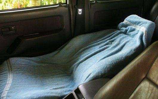 Если машина имеет короткую базу или по каким-то иным причинам подготовка спального места в задней части салона представляется невозможной — значит спать придется на передних сиденьях. Опускаете спинку, насколько это возможно, сверху укладываете спальный мешок, поверх него кладете себя. Если вы собираетесь спать в одиночестве, то лучше постелить себе на пассажирском сиденье, там вам не будут мешать педали и руль.