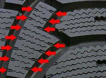 Расположенные по краю шашек протектора возбудители работы ламелей усиливают их свойства при скользких погодных условияхРисунок протектора тоже усовершенствован. Увеличено количество ламелей – до 2 тыс., благодаря чему достигается наилучшее сцепление на снегу и льду. Изгибающиеся наружу зигзагообразные ламели «вгрызаются» в дорожную поверхность. А специальные «возбудители» по краям беговой дорожки усиливают работу ламелей на скользком дорожном полотне.
