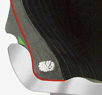 Изменена также форма нижнего слоя беговой дорожки. Находящийся над стальным брекером более твердый резиновый слой, сечение средней части которого усилено, значительно улучшает чувствительность и управляемость автомобиля на сухой поверхности. Увеличена и ширина стального брекера. Этим достигается лучшая управляемость и прочность каркаса шины.