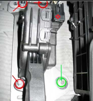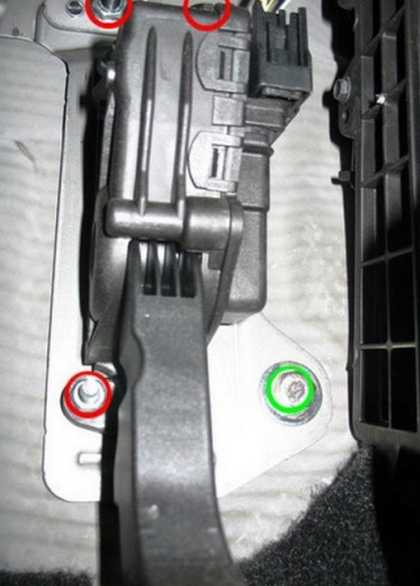 вообщем что увидал, что педаль акселератора на двух болтах(вместо 3), тобишь 1 нет, притом второй болт вообще в недоступном месте, я понял что со своими инструментами — я туда не долезу 100% (видать надо какой то переходник на головку или фиг его знает). приэтом первоночально открутил нижний болт, зря как выяснилось, закрутил обратно.