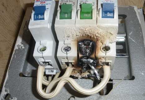 Если вы не можете по запаху определить, то начинайте зрительный осмотр. Проверяйте все углы, также посмотрите, как найти провод в стене. Может загореться автоматический выключатель, как показано на фото.