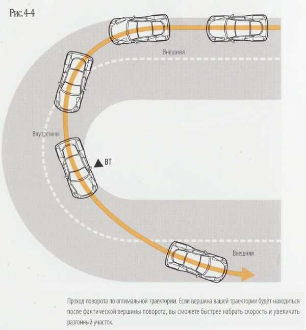 «Гоночная линия» — это самая прямая линия прохождения поворота. Суть в том, что на прямой у нас нет никаких проблем с колесами, так почему бы не проходить поворот по прямой? На изображении вы можете увидеть широкую, узкую и гоночную линии поворота. Проехать по этой линии можно, используя всю ширину дороги. Если вы хотите сохранить свой автомобиль в идеальном состоянии, то использование полосы встречного движения при повороте – ваш вариант. Я бы крайне не рекомендовал этого делать на общественных дорогах, но у вас, надеюсь, имеется своя голова.