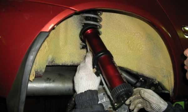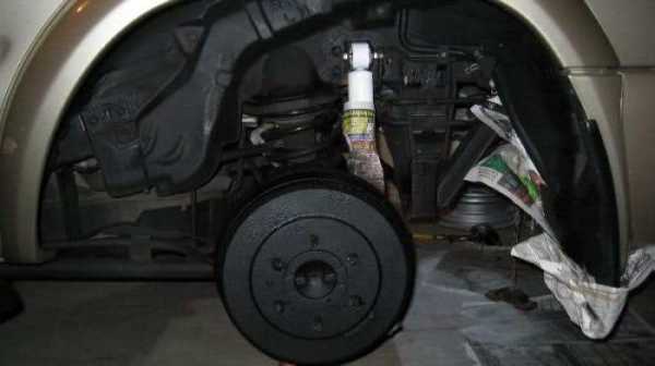 Автомобиль следует установить на подъемник, эстакаду либо яму. Если всего этого нет в наличии, то поможет высокий домкрат. Затем снимаются колеса и брызговики, конечно, если они есть.