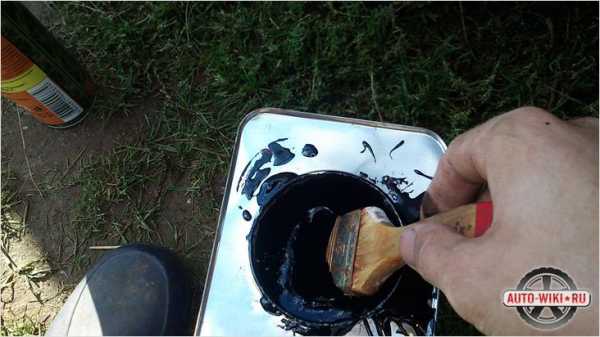 5. После того, как первый слой окончательно просох — наносится второй слой из битумной мастики. Наносим кисточкой и как можно ровнее и обильнее. Ведь это Ваша машина, нечего мастику жалеть.