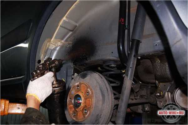 1. Авто загоняется на подъемник или же высокий домкрат, снимаются колеса и брызговики, если они конечно же установлены.