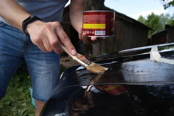 Наносил при помощи обычной малярной кисти. Местами проходил в 2 слоя. Расход большой — 1 банка ушла на клюв, бампер и немного крыльев. Для таких автомобилей как мой бегемотик, будет интересен сразу литровый формат упаковки.
